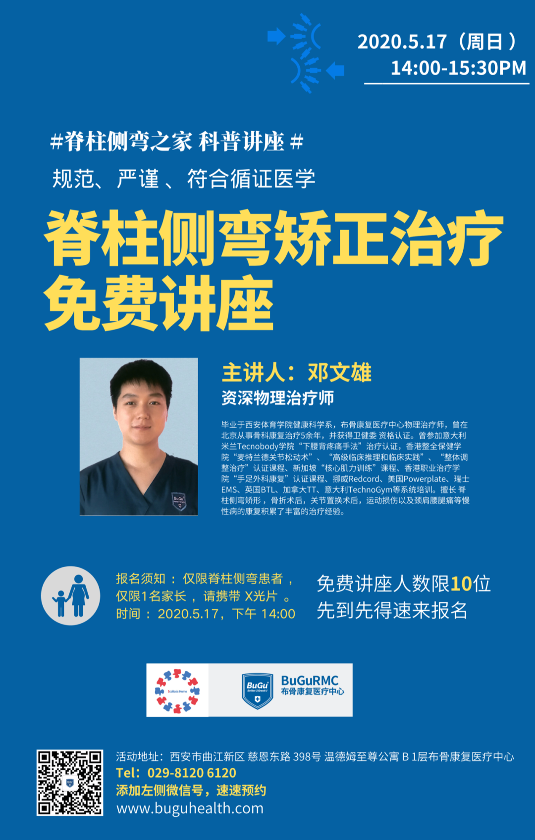 #脊柱侧弯科普讲座# #免费康复评估以及指导# 日期:2020年7月26日下午13:30 地点:西安市曲江新区慈恩东路398号温德姆至尊公寓B1层布骨康复医疗中心 内容:脊柱侧弯物理治疗科普&免费评估以及指导 合作支持:西安市红会医院脊柱外科&布骨康复医疗中心 专家支持:西安市红会.....