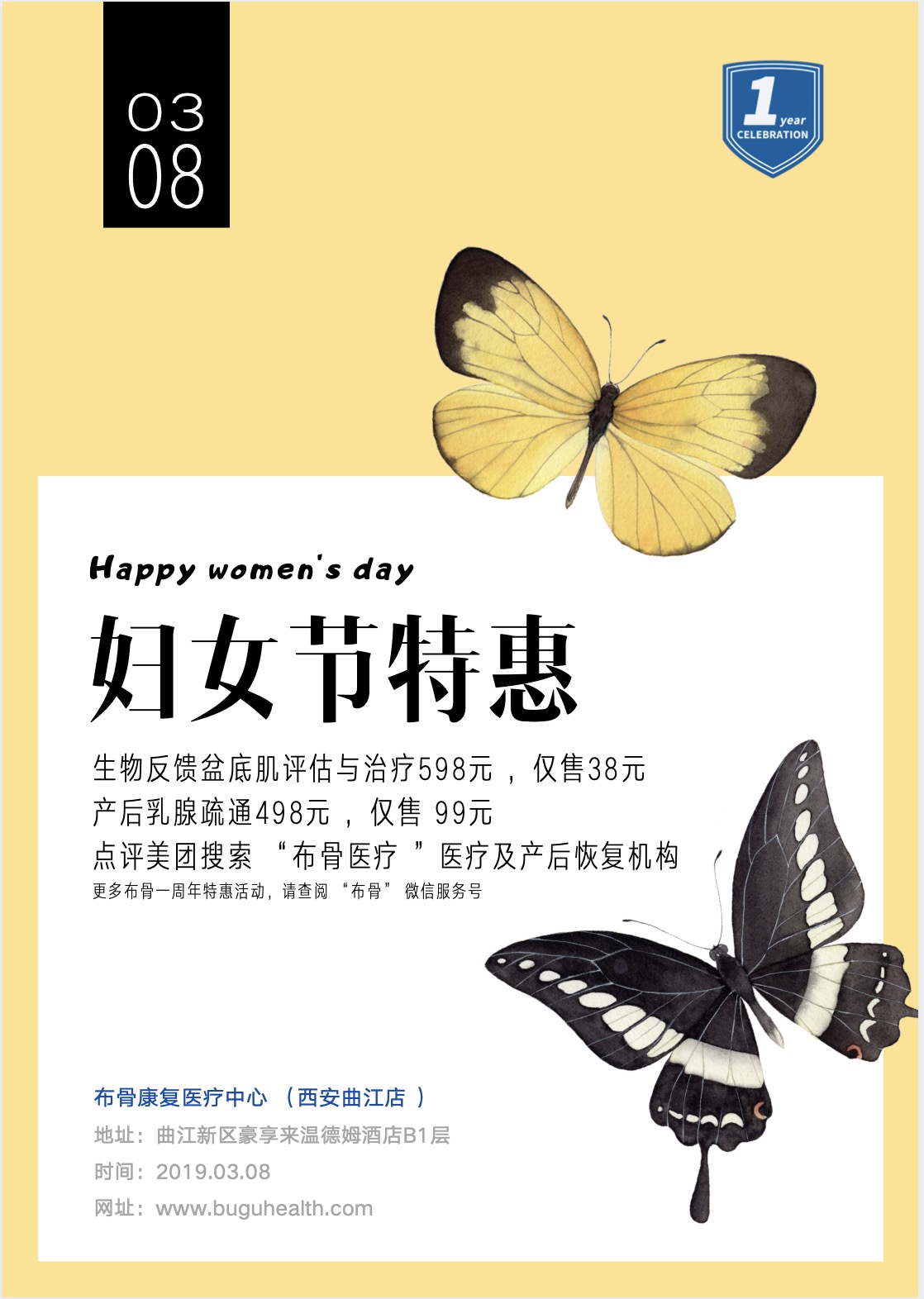 布骨庆祝38女神节,特惠活动如下:1、(生物反馈)盆底肌功能评估,原价498元,现价38元,每人限购1次,使用期限下单后60天内。点击点评美团链接购买;2、新患者首次购买疗程,可以在大众点评购买199元/次的治疗(原价600元/次),每人限购3次,点击点评美团链接购买;3、产后乳腺疏通特惠价格99元.....