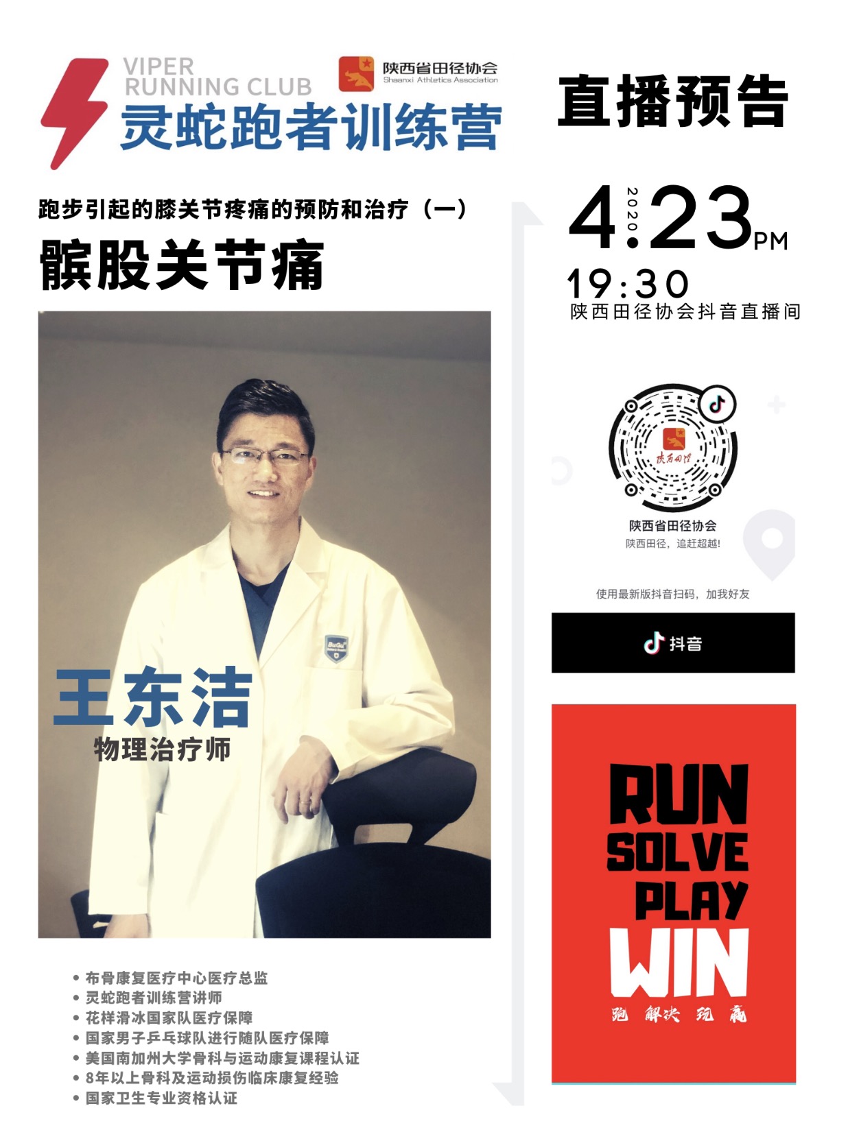陕西省田径协会抖音直播,4月23日晚7:30。讲师:王东洁 布骨康复医疗中心医疗总监,灵蛇跑者训练营讲师 花样滑冰国家队医疗保障,国家男子乒乓球队医疗保障 美国南加州大学骨科与运动康复课程认证 8年以上骨科与运动损伤临床康复经验,国家卫健委专业资格认证.....