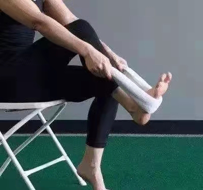 跟键牵拉:双手持毛巾末端并绕过足底, 慢慢牵拉毛巾至极限,膝关节屈曲位,坐位, 膝关节屈曲90, 双手持毛巾末端并绕过足底, 慢慢牵拉毛巾至小腿后侧有牵张感, 维持5秒钟。