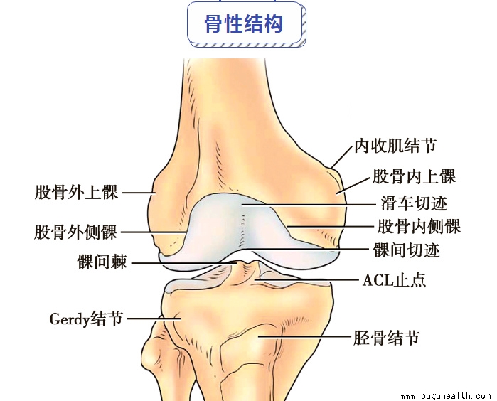 骨性膝关节由股骨远端、胫骨近端和髌骨共同组成。其中股骨内外髁与胫骨内、外侧平台分别组成内、外侧胫股关节。髌骨与股骨滑车组成髌股关节。关节周围的骨性结构表面不光滑,存在很多突起,是韧带、关节囊和肌腱起止点。