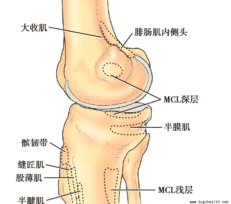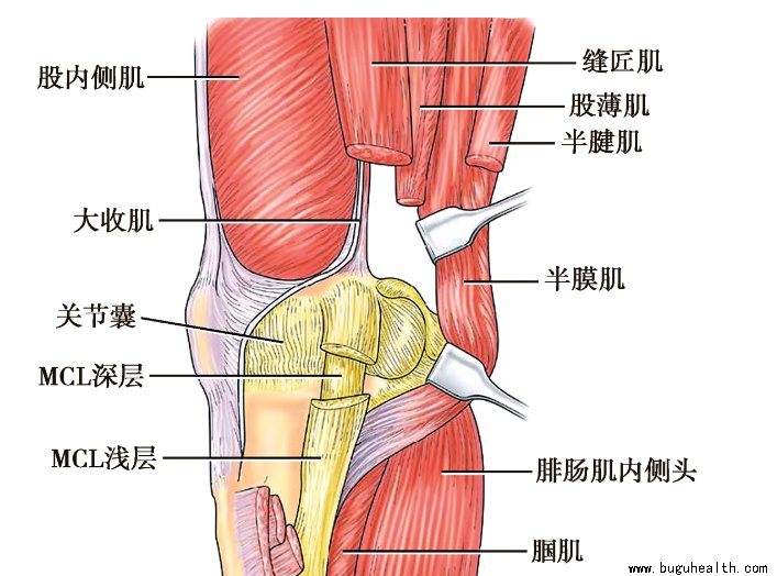 深层即膝关节内侧的关节囊,附着于股骨和胫骨关节缘。MCL浅层的深面关节囊增厚部为MCL深层,起于股骨内上髁,与内侧半月板融合。