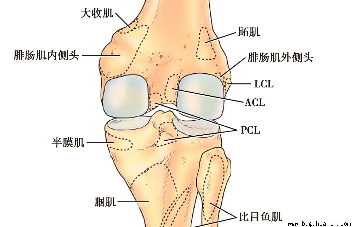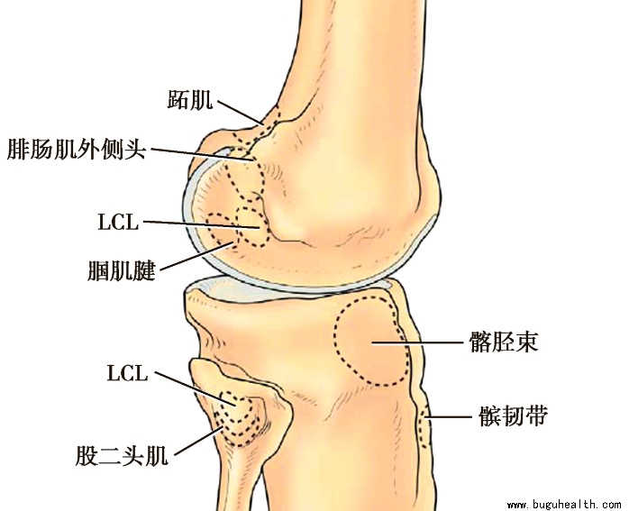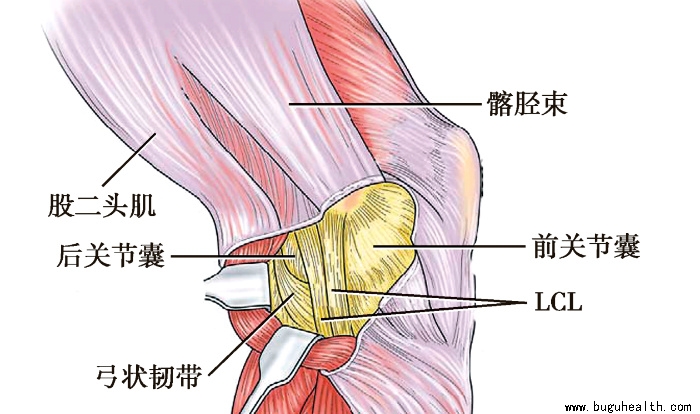 深层结构位于LCL深面,包括关节囊、腘斜韧带、弓状韧带等。腘斜韧带为半膜肌腱的延续部分,纤维自胫骨内髁后方斜向外上,止于股骨外髁后上方。弓状韧带起自腓骨小头,其外侧部纤维垂直向上止于股骨外髁,其余纤维向内上融合于关节的后纤维囊。弓状韧带覆盖在腘肌腱表面。