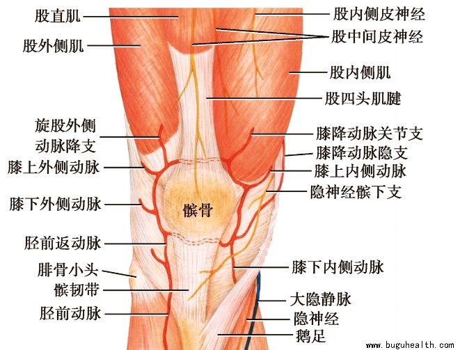 膝关节前方的深筋膜绝大多数与肌肉和肌腱紧密相粘连,在外侧与髂胫束下端相融合,在内侧与缝匠肌腱相融合。营养膝关节的动脉为腘动脉分支,穿过深筋膜浅出,包括膝上内侧动脉、膝上外侧动脉、膝下内侧动脉、膝下外侧动脉、膝中动脉、膝降动脉关节支、旋股外侧动脉降支和胫前返动脉等,在髌骨周围组成膝关节动脉网,营养关节及其周围的肌肉。