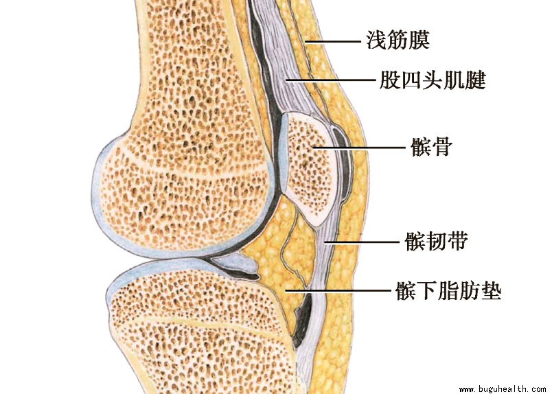 皮下的浅筋膜即脂肪层,位于深筋膜浅面。皮肤与髌骨之间的浅筋膜层称为髌前皮下囊,此囊被纤维隔分成数个小囊,其功能为在髌骨与皮肤间滑动时承载压力。
