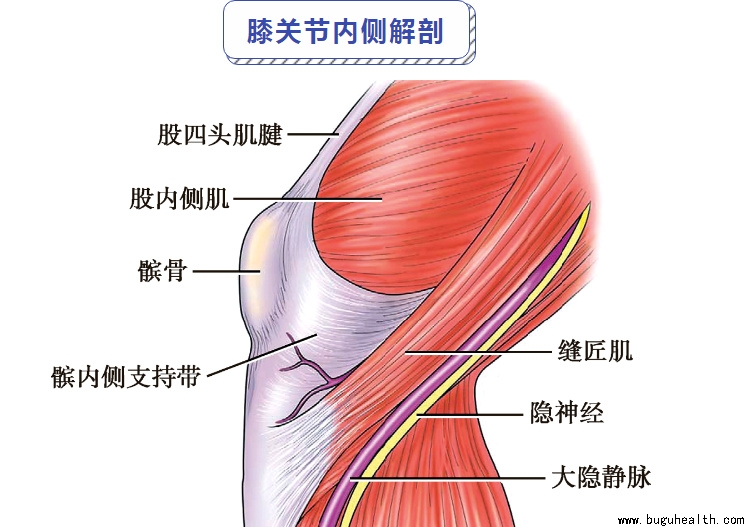 膝关节内侧支持结构浅层,称为筋膜层,包绕缝匠肌