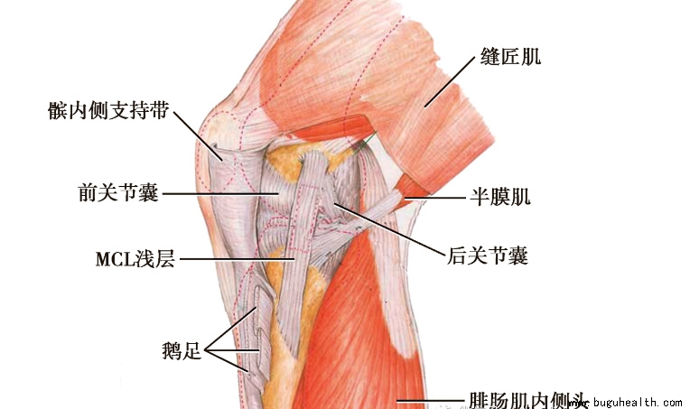 根据Warren and Marshall的三层解剖模式理论,膝关节内侧结构分为浅层、中间层和深层。浅层为大腿深筋膜的延续,包绕缝匠肌。其前方与股内侧肌的纤维相融合,构成髌内侧支持带。后方与覆盖腓肠肌及腘窝顶的深筋膜相延续。