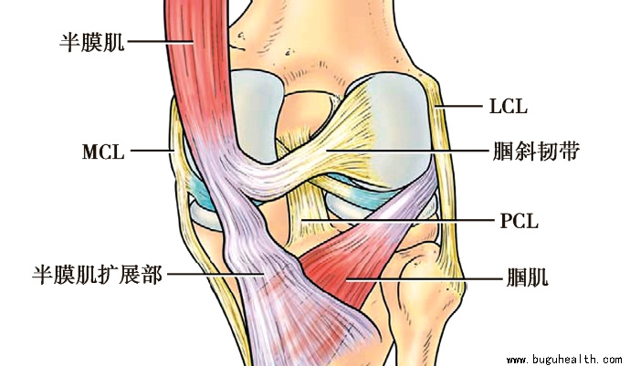 半膜肌腱止于胫骨后内侧面,有三个扩展部,其中一个扩展部于MCL浅层的深面止于关节囊附着处的下方;另一扩展部延续为腘肌筋膜;第三个扩展部向外上方延伸,经腘窝止于股骨外侧髁,形成腘斜韧带。