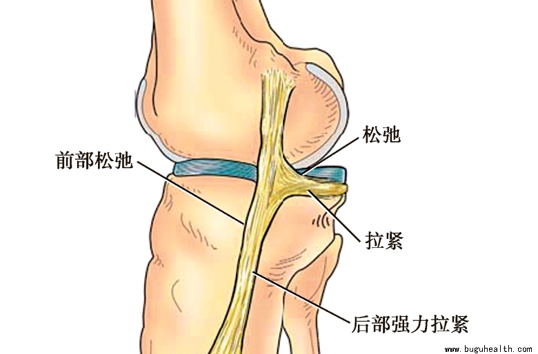 内侧副韧带分为前后两束。前束纤维较长,垂直向下止于胫骨内侧关节面下方,与关节囊及半月板间有松弛的结缔组织相隔;后束纤维较短,在关节水平呈扇形向后止于关节囊、半月板。内侧副韧带的前后两束,在关节屈伸时起着不同的作用:当膝关节屈曲时,韧带前束的后部纤维松弛,前部长纤维拉紧并后移;后束上方拉紧,下方松弛。伸直时,前束的前部纤维松弛,后部纤维强力拉紧;后束下方拉紧,上方松弛。