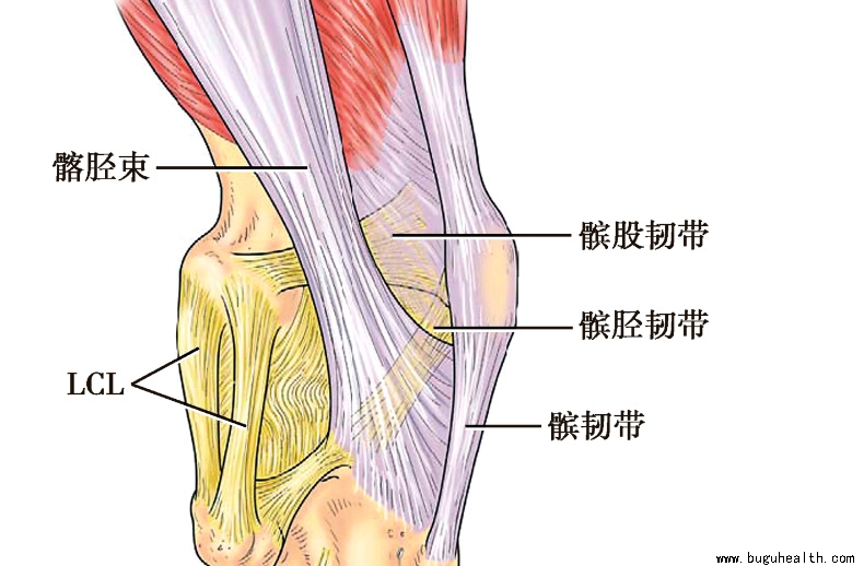 中层主要结构为外侧副韧带(Lateral collateral ligament,LCL)。呈圆条状,上起自股骨外上髁,向下止于腓骨小头,与关节囊及半月板间有腘肌肌腱相间隔。LCL居关节外后方,在伸膝时紧张,屈膝时松弛。但在屈膝外旋或内旋时则皆紧张。