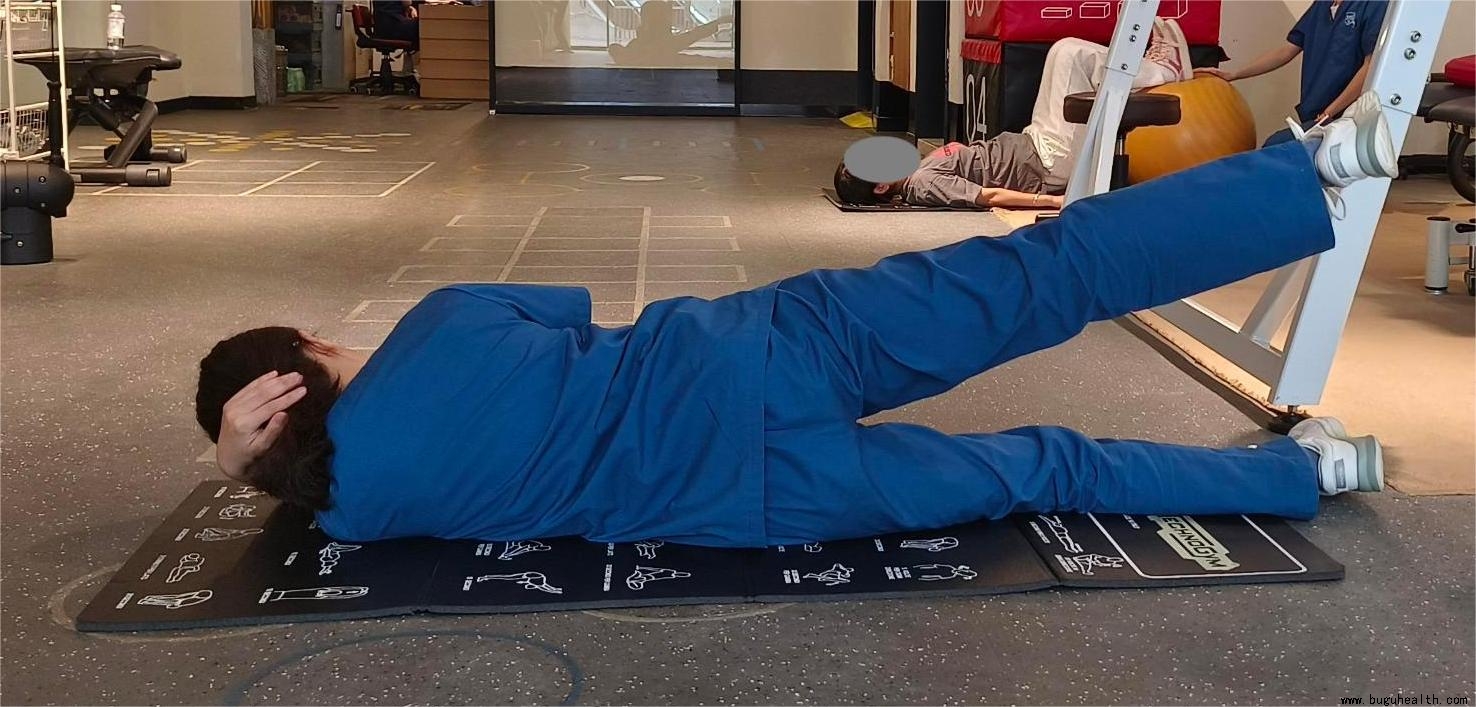 直腿抬高训练:仰卧位,患腿伸直抬高至距离床面30cm,保持10s,一组15次,每天进行5组。