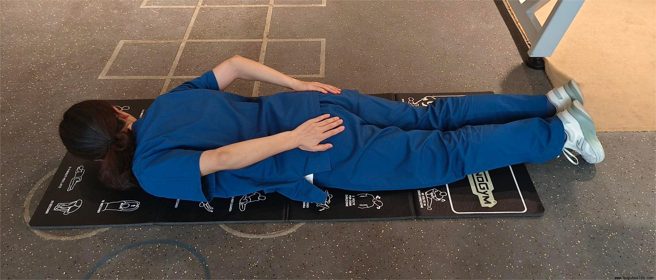 侧抬腿训练:找一面墙,背对着墙侧躺,患侧腿在上,距墙20cm,保持骨盆垂直于地面,患侧腿向后紧贴墙面上下移动。