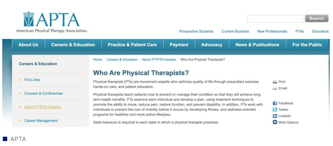 什么是物理治疗师根据美国物理治疗协会APTA的定义,物理治疗师,是一种通过徒手、仪器、运动治疗,来改善患者的身体疼痛、功能受限的医疗职业。