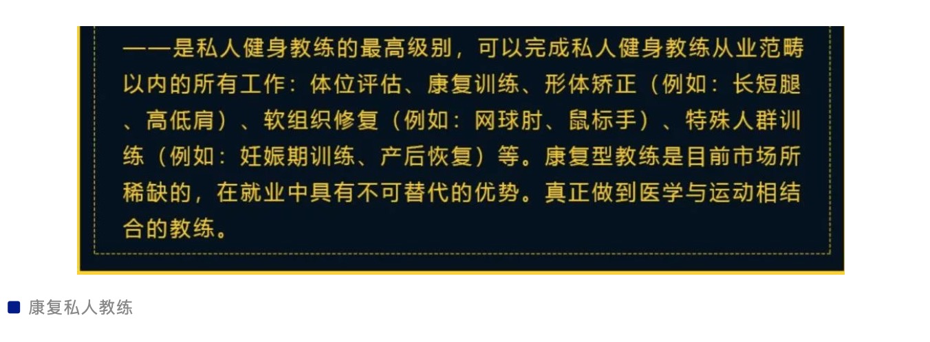 比如,在部分培训机构中「康复训练私人教练」这一职业称谓,被归为私人健身教练的最高级别,在机构的具体介绍中,「康复训练私人教练」可以完成体位评估、康复训练、形体矫正、软组织修复、特殊人群训练等内容。