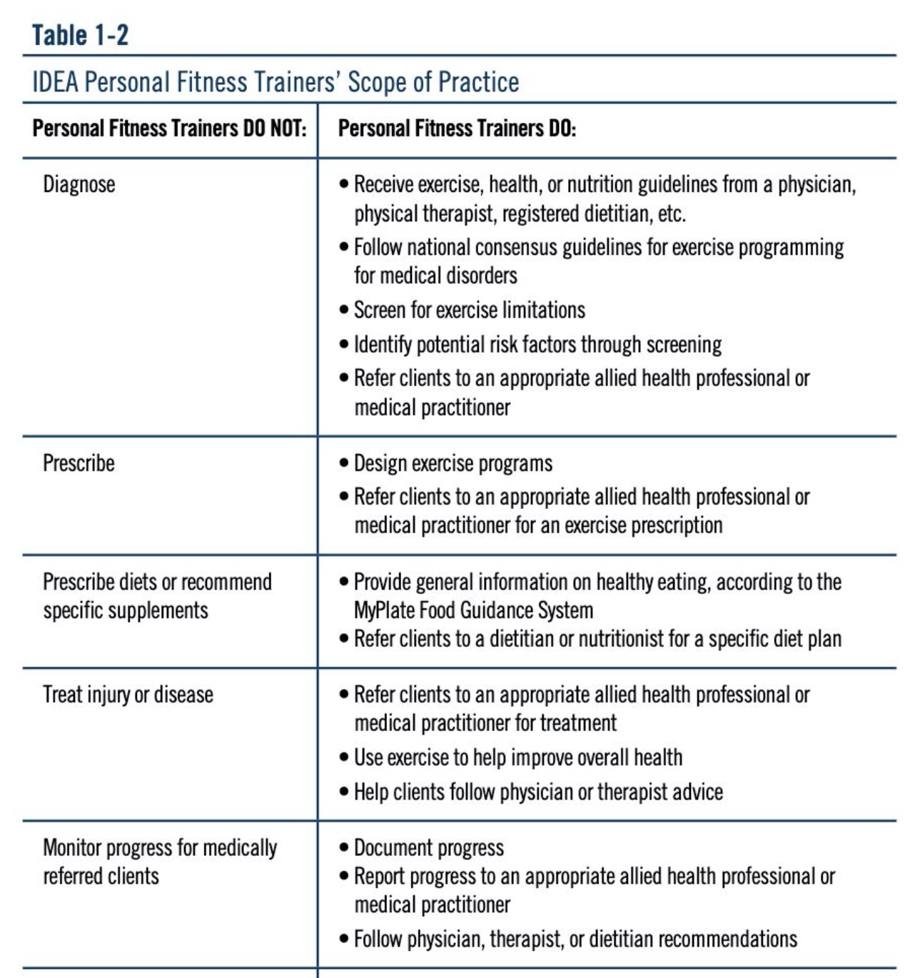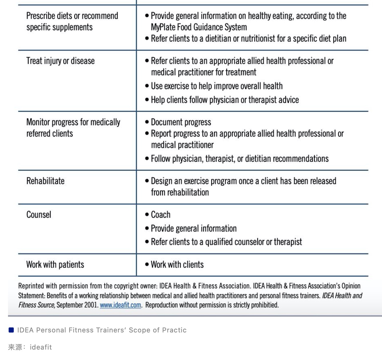 在IDEA Personal Fitness Trainers’ Scope of Practic中提到,私人教练不可对用户,进行康复治疗、身体伤病改善、实施医疗诊断等任何医疗服务,甚至在NFPT的教练规范中指出,不可为用户提供手法治疗、按摩理疗等接触性服务。
