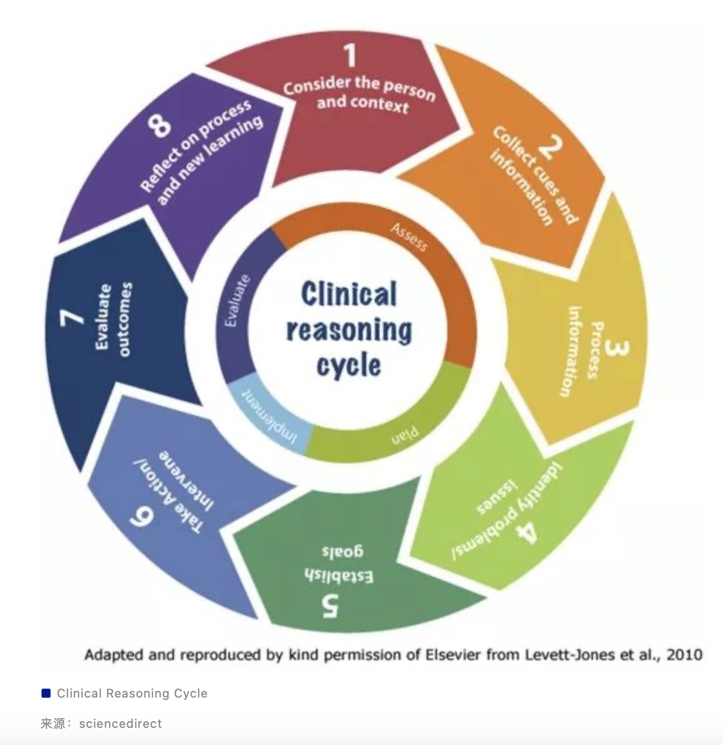 在临床推理中常用的Clinical Reasoning Cycle,就包含了「评估假设」、「计划制定」、「治疗实施」、「再次评估」,物理治疗师往往要对实际执行中的线索,进行解读,以不断更新迭代诊疗计划。