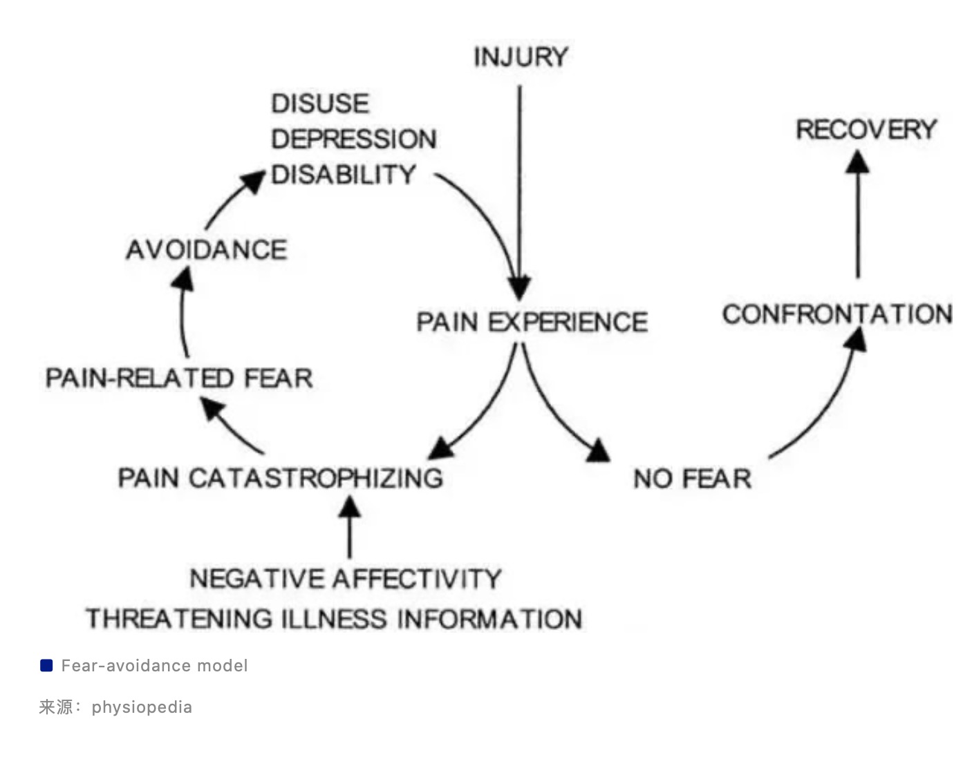 除了物理疼痛以外,Fear-avoidance model很大程度阐明了,心理病也会导致物理病。这类患者没有功能障碍,却因心理认知问题,导致功能障碍的恶性循环,因此通常采用渐进性运动疗法,向患者证明并无障碍。