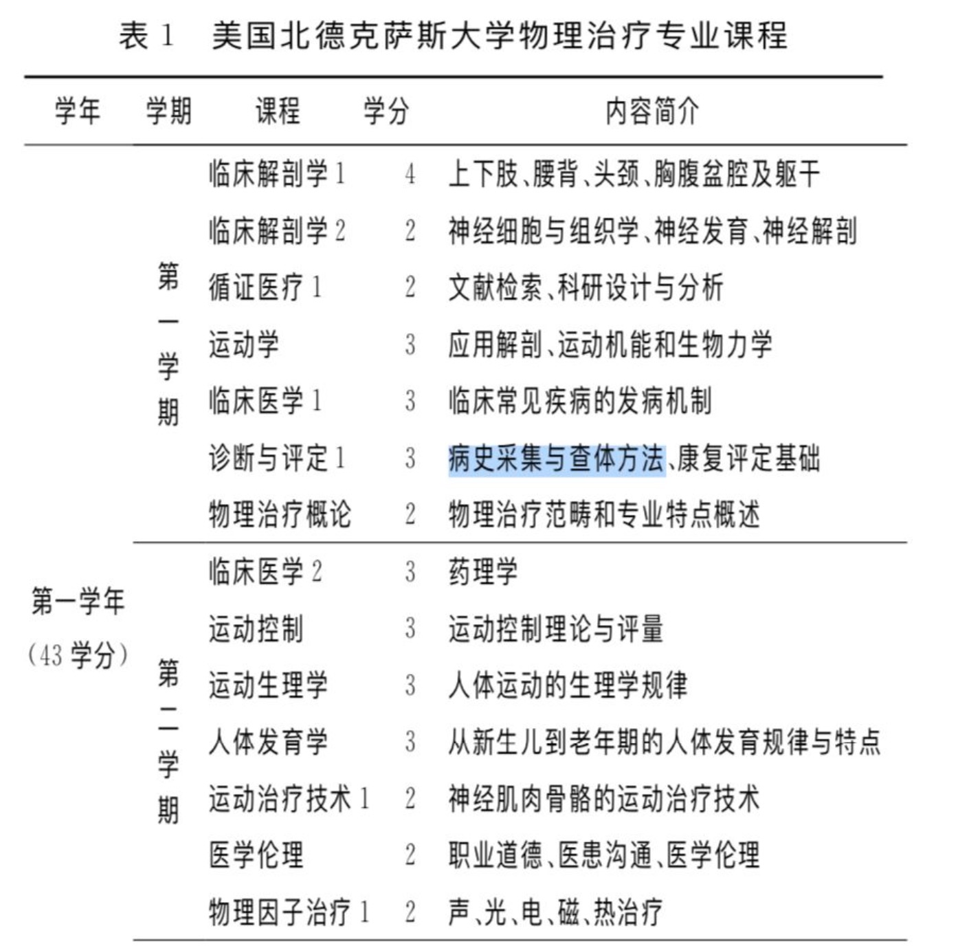 相较而言,仅以美国北德克萨斯大学物理治疗专业,第一学期的课程安排为例,包含了上下肢、胸腹盆腔、神经细胞、神经解剖的2门临床解剖学课程,同样,病史采集查体方法,以及文献检索、科研设计与分析,都是需要考核的内容。