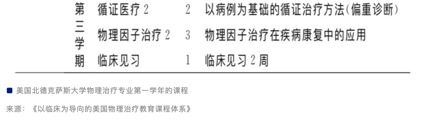 而只以临床实习作为对比,美国APTA规定,物理治疗临床教育至少需要30周,在匹兹堡大学DPT课程设置中第三学年,有夏秋春三个季节分别要总计要进行9个月的全职实习。
