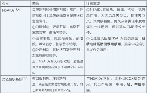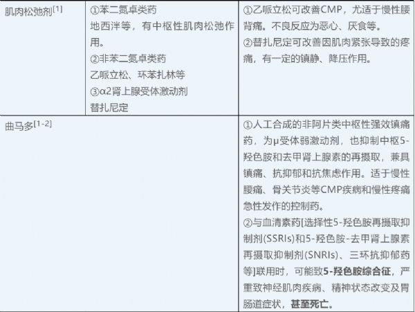 ·口服非甾体类消炎药(NSAIDs)联合外用NSAIDs可用于中、重度疼痛者。外用NSAIDs可作为口服NSAIDs的局部增效剂,可减少口 服NSAIDs剂量而降低胃肠道等不良反应。外用NSAIDs也可联合其他作用机制的 药。 对乙酰氨基酚有解热、镇痛作用,与NSAIDs联合可发挥镇痛相加或协同效应。慢性肌肉骨骼性疼痛由于炎症、缺血、营养缺乏、代谢障碍、外伤、卡压等因素可 致神经病理性疼痛。抗抑郁药,抗惊厥药可用于神经病理性疼痛,可联合曲马多, 阿片类药。另外,注射制剂一般不适于CMP的长期使用,仅用于慢性疼痛急性发作、爆发痛明显者,或急性创伤、围术期使用。有的止痛药会引起相应的不良反应,比如,阿片类药物的不良反应主要包括便秘、恶心,呕吐,嗜睡、瘙痒、头晕、认知障碍、呼吸抑制等。除便秘外,阿片类药物的不良反应大多是暂时性或可耐受的。恶心、呕吐、嗜睡、头晕等不良反应,大多出现在未使用过阿片类药物患者的用药最初几天,可考虑同时给予甲氧氯普胺等止吐药预防恶心、呕吐,如无恶心症状,则可停用止吐药。便秘症状通常会持续发生于阿片类药物治疗期间,应注意多饮水、增加纤维食物、适当活动,必要时使用大便软化剂。