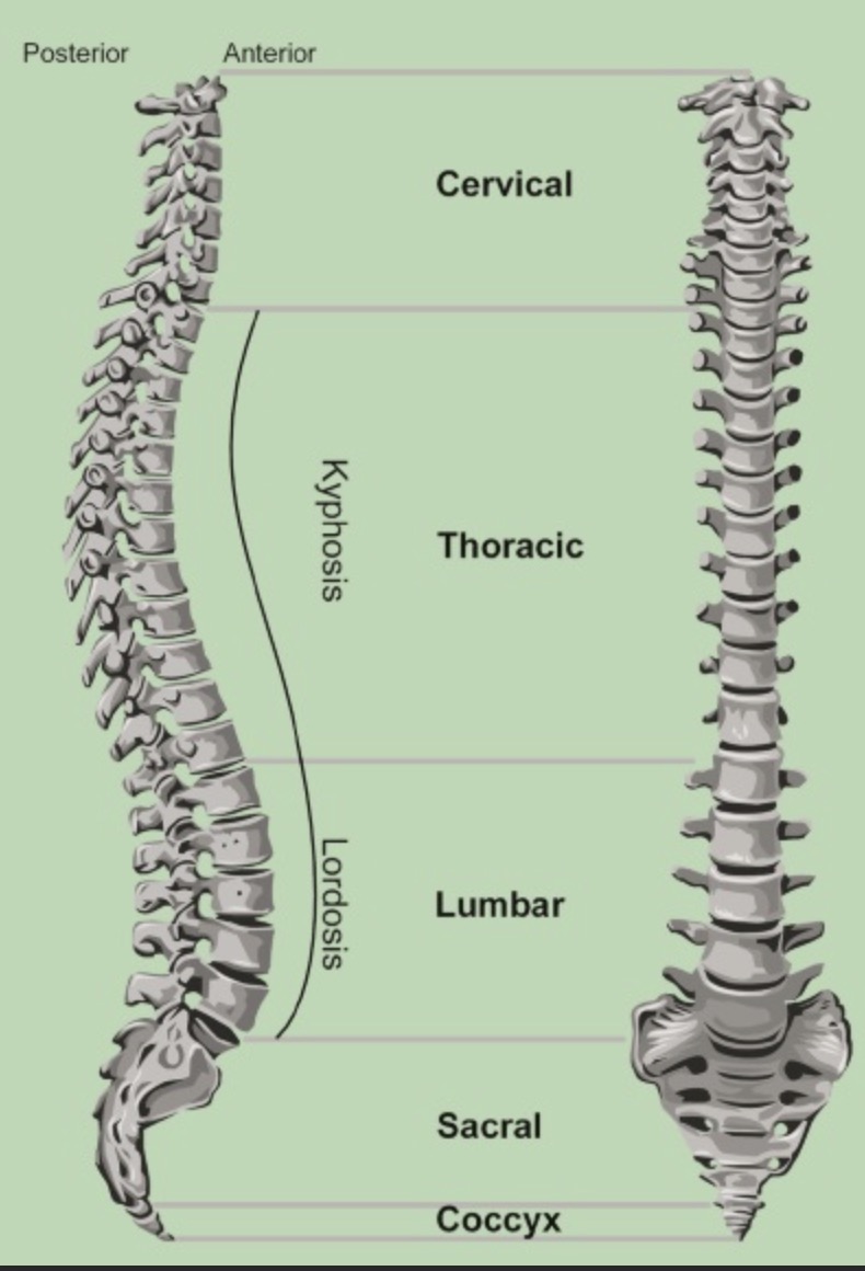 如果从侧面观察脊柱的外观,则会发现我们的脊柱并不是一条直线,而是呈现出四个生理弯曲,即颈曲、胸曲、腰曲和骶曲。