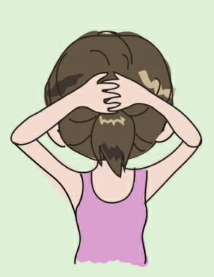 ● 颈后伸肌群:将手放在脑后,头部向后压。其余步骤同前。维持5秒后,放松,重复5~10次。