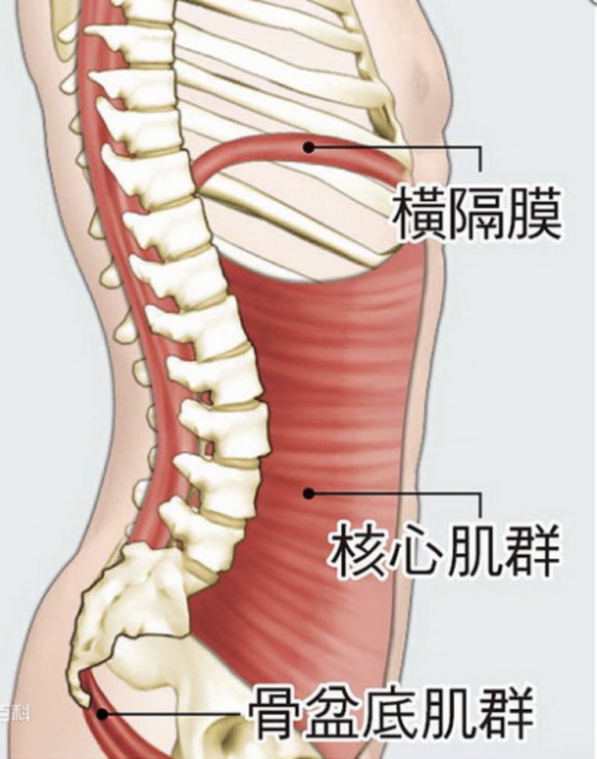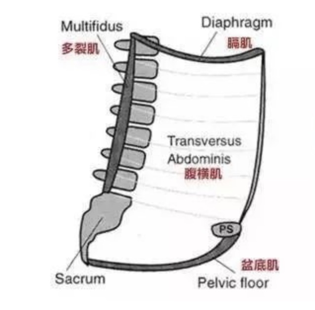 核心区域的肌肉主要是指环绕我们身体躯干中心,提供身体稳定和力量源泉的肌肉群,这些肌肉往往是联接于脊椎或腰部以及骨盆区域。这些肌肉有很多,但从起到稳定作用的角度来讲,最深层的核心肌肉是起到关键作用,他们由腹横肌Transversus Abdominis、横膈膜Diapheram、多裂肌Multifidus、盆底肌Pelvic Floor等深层肌肉所组成的一个具有弹性的框架结构,这几组肌肉群协同收缩可使身体核心区域形成一个刚性的联接,帮助人体更好的完成躯干的稳定,以及力的有效传递。当我们走路、跑步、转身、弯腰或跳跃时,稳定的核心始终在默默地发挥作用,若没有深层的肌肉协同工作提供结构的相对稳定,我们的脊柱将是非常的脆弱的。