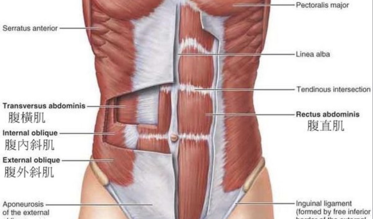 腹横肌:联接着胸腰筋膜和腹白线,像一根腰带一样,围绕着我们的身体腹腔,就像是屋子的墙壁,它是我们腹部最深层的一条肌肉;深层的腹横肌力量越强,就越能把外层的六块腹肌撑起来。