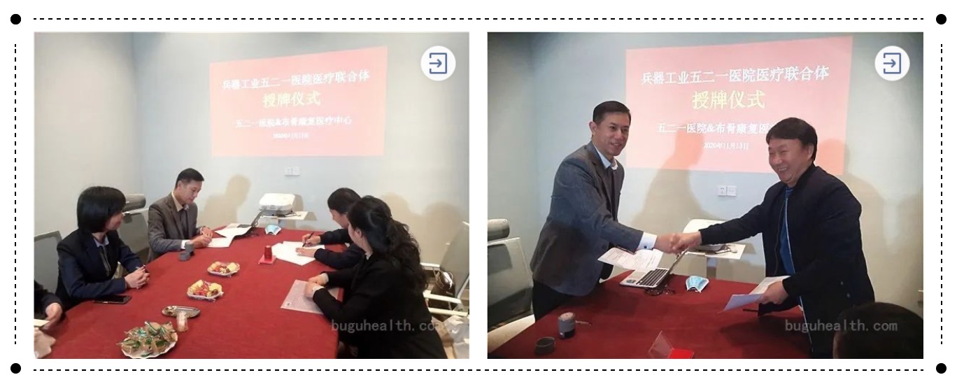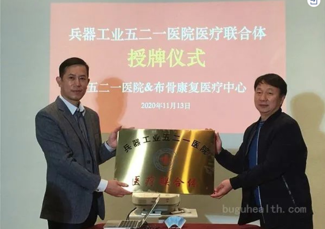 2020年11月13日,布骨康复医疗中心正式加入兵器工业五二一医院的医疗联合体,并签订医联体合作协议,授牌仪式在布骨康复医疗中心的曲江店内举行。