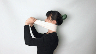• 将毛巾向斜上方拉扯,同时头往后仰;