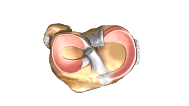 每个膝关节内有两个半月板,内侧半月板和外侧半月板。半月板,附着于小腿的胫骨上端,它周围部分较厚,中央部分较薄。半月板上表面接触大腿的股骨端,略凹陷,下表面接触小腿胫骨端,较平坦,从而加固球形的股骨端与较平坦的胫骨端的稳定性,使膝关节活动自如。半月板可随着膝关节运动而有一定的移动,伸膝时半月板向前移动,屈膝时向后移动。