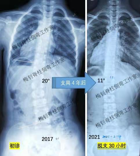 总结:如果脱支具后脊柱反弹较大,要检查支具有没有问题,如果支具没有问题就需要坚持穿戴,在支具的引导和脊柱的不断生长下,相信脊柱终会有可喜的变化。脊柱侧弯、脊柱侧弯、脊柱侧弯