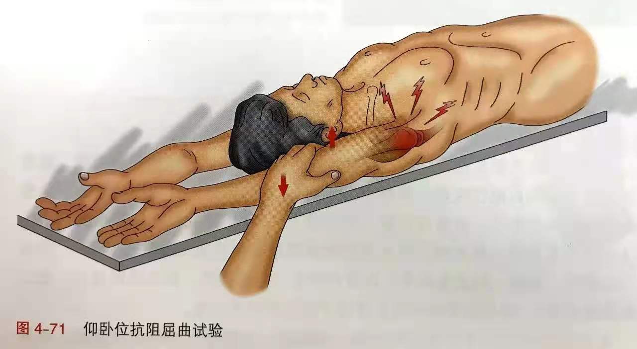 患者仰卧位,双上肢前屈上举置于检查床上,检查者站在患侧,用手压住患侧肘关节以远的前臂部位,使患者下压患肢而检查者给予对抗阻力,如果可以引出位于肩关节深方或后方的疼痛且同样动作健侧无痛,则结果为阳性。