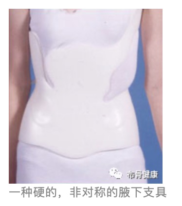 目前有两种主要类型的支具:塑料(硬的)支具和软的弹性支具(动态的),硬支具就像一个贝壳,从腋窝到骨盆包裹上身的前面和后面,可通过支具上的三道尼龙索带扎紧,拆除简单以便于洗澡或进行其他活动。