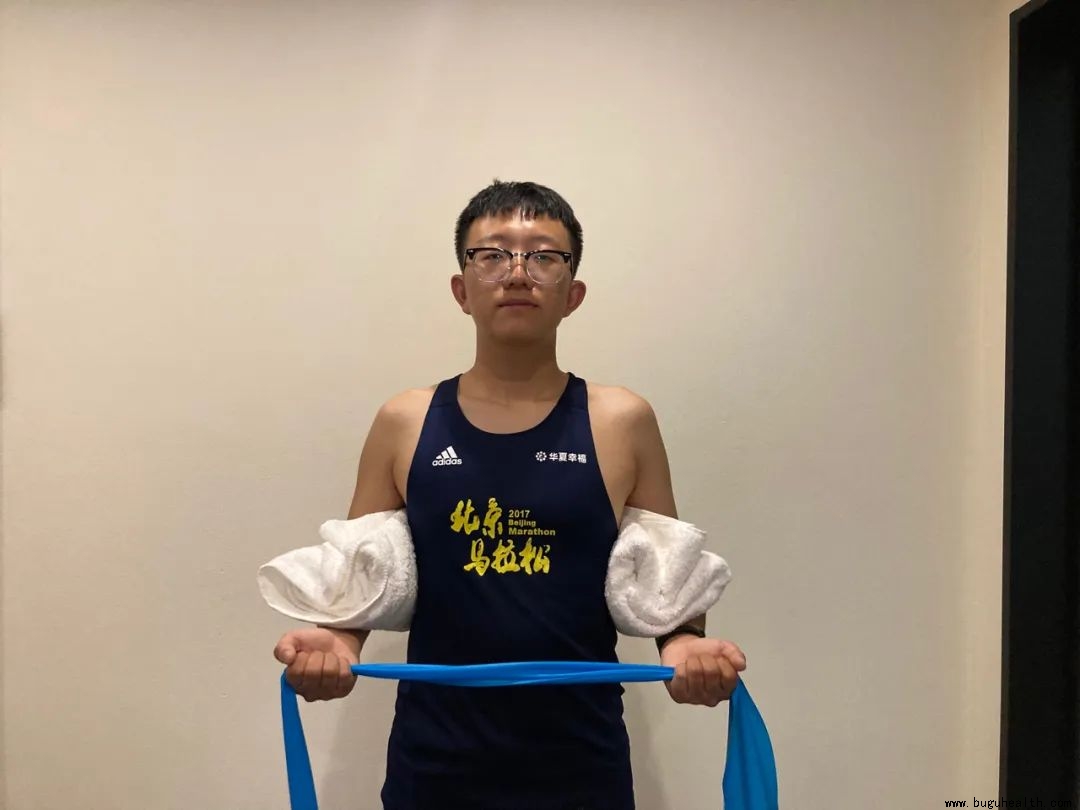 注意在整个过程中,控制毛巾卷不要掉落,弹力带的松紧程度根据自我感觉进行调整