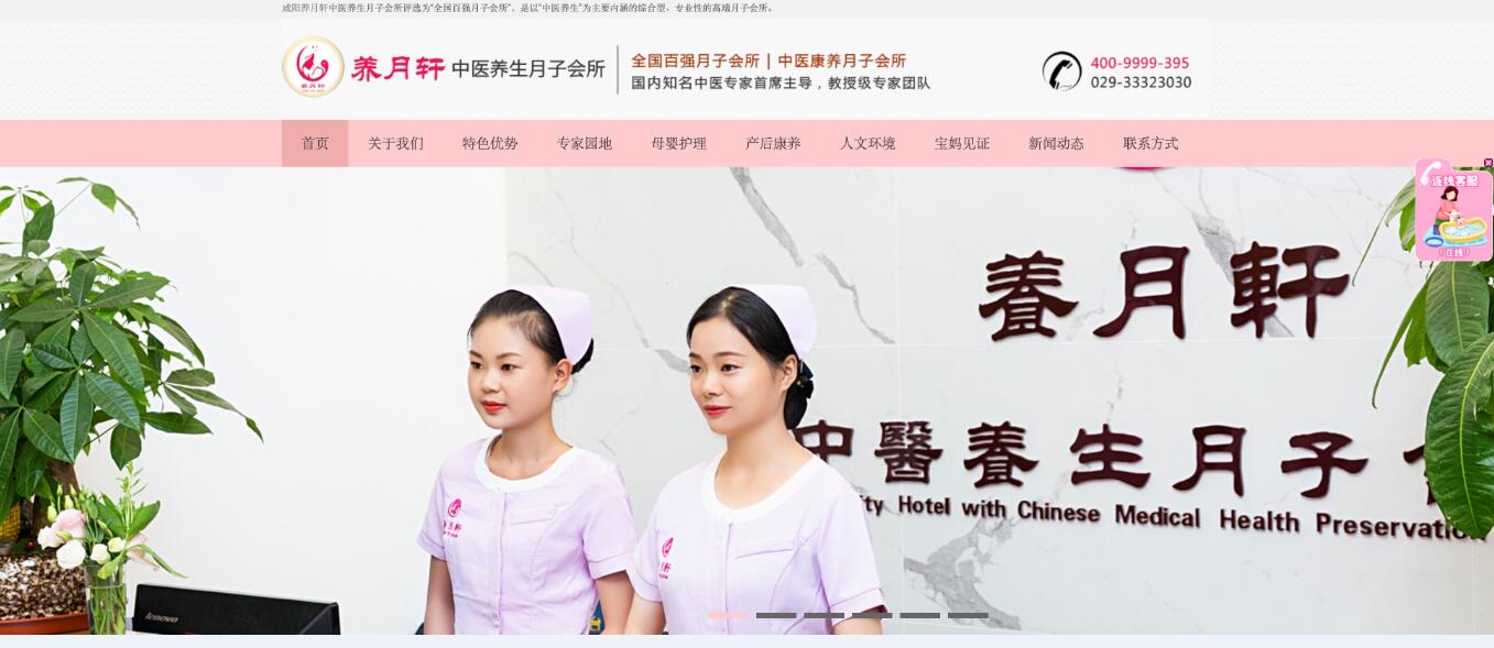 全国百强月子会所——咸阳养月轩中医养生月子会所是大型以“中医养生”为主要内涵的综合型、专业性的高端月子会所。设有名中医馆、康养讲习馆、康养灸疗馆、熏蒸养生馆、美容养生馆、音乐香疗馆、形体恢复馆。