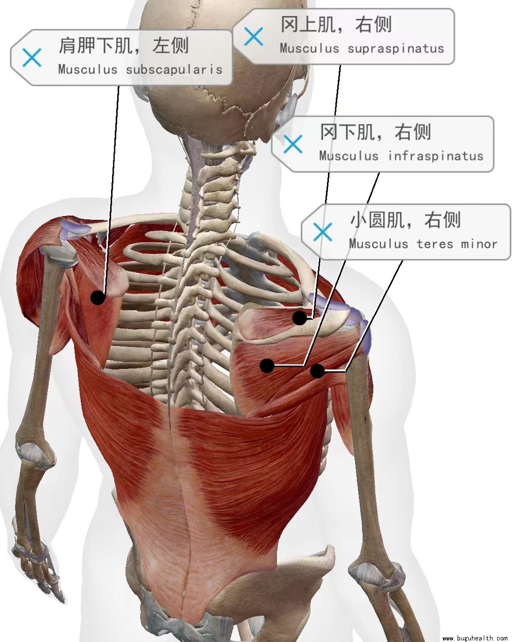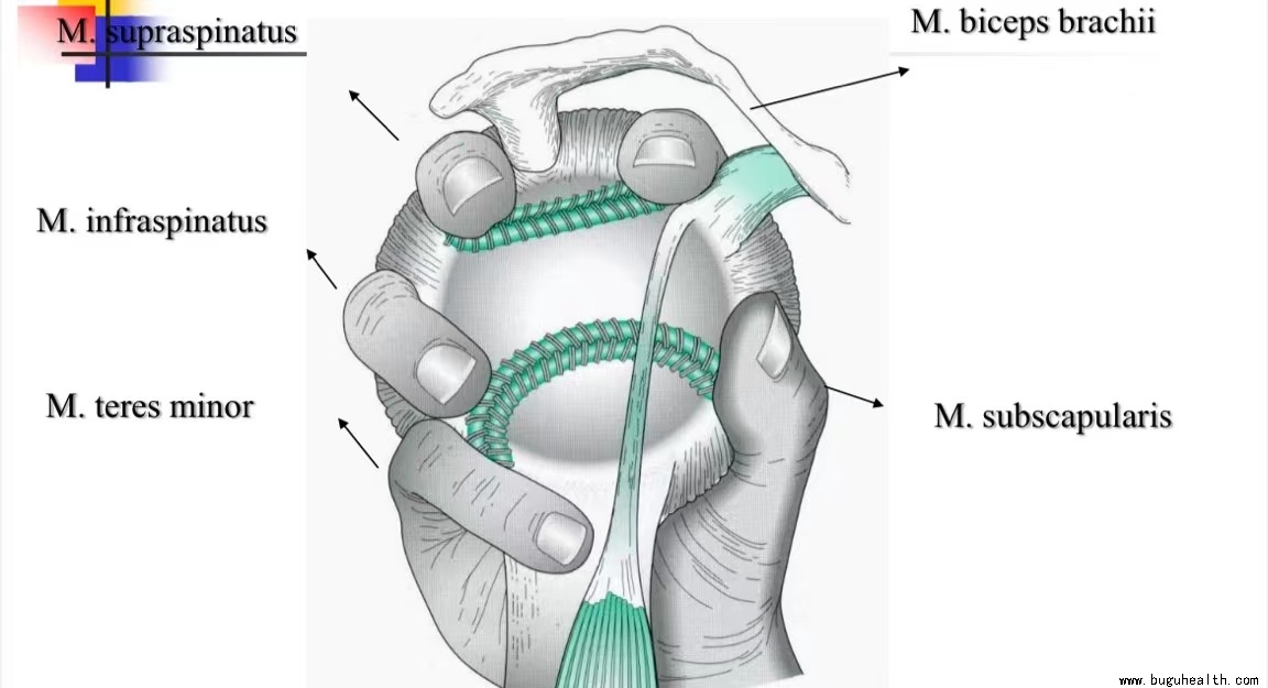 ② 肱二头肌长头:起源于上盂唇和盂上结节,下行于关节腔内肱骨头前方,结节间沟内。外展外旋位,肱二头肌长头紧张将肱骨头压在关节盂内,维持稳定同时对下盂肱痛鸱值8春系淖饔谩�