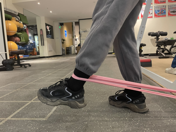 固定弹力带一侧,面向固定侧,患肢支撑,微微屈膝,健侧腿向后拉伸弹力带;转身与弹力带平行,患肢支撑,健侧腿向固定侧相反位置拉伸;背对弹力带固定侧,患肢支撑,健侧腿向前拉伸弹力带;转身与弹力带平行,患肢支撑,健侧腿向弹力带相反方向拉伸。