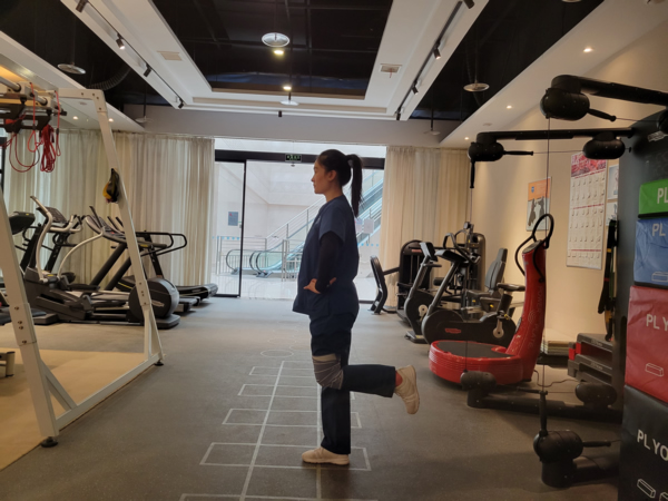 动作要点:健侧单脚支撑,保持骨盆中立位,患侧大腿保持直立位,用大腿后群肌肉将小腿勾至最大幅度,再缓慢放下回到起始位置。每组进行15-20次,每天进行3组。动作过程要注意患侧大腿始终保持垂直于地面,躯干和骨盆稳定。