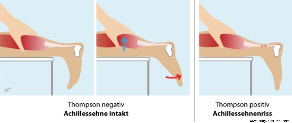 Thompson test是一个很好确认跟腱是否断裂的测试方法。首先让受试者趴在床上,脚踝露出床外,然后去挤压受试者的小腿。如果跟腱连续性完好,则脚踝会顺势跟着挤压动作抬起。