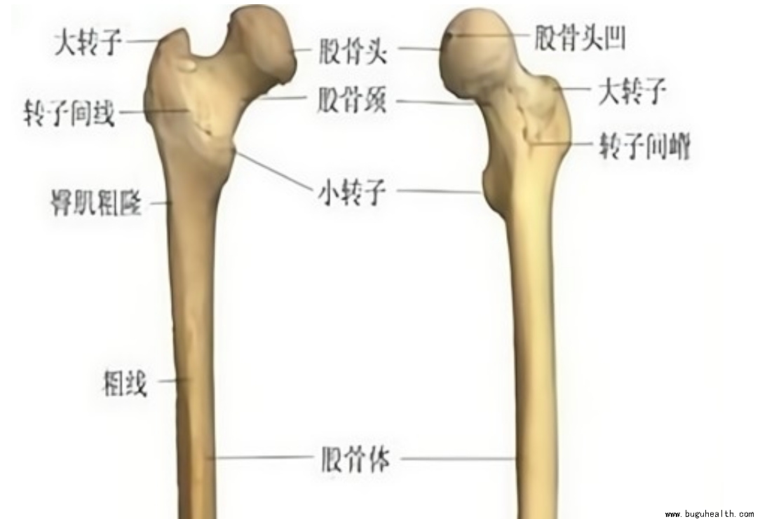 股骨又名大腿骨、髀骨,是人体最长的管状骨。上端以股骨头与髋臼构成髋关节,下端与髌骨、胫骨上端构成膝关节,起着支撑全身体重的作用。