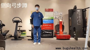 站立位时,右往身体右侧跨一大步,弓步下蹲的同时身体往下压,身体以倾斜。坚持秒后换到对侧腿