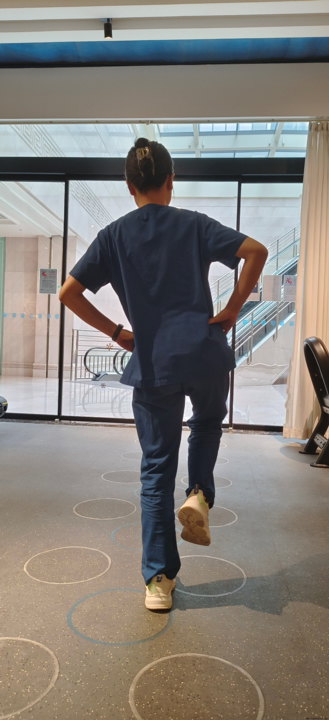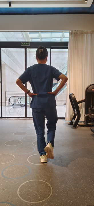 尤其是伤脚支撑的时候,这种异常步态在膝、踝关节术后或者是存在长期的关节疼痛以及不稳的人群中常见,如果出现这种情况,可能与你经常避免使用伤腿或者臀中肌力量不够有关,所以进行一些单腿的练习和增强臀中肌的力量就非常重要了,这里推荐最简单的单腿站训练和侧抬腿训练,单腿站着重在于正确的将重心平移到伤腿上,侧抬腿在这一阶段能够避免你在站立位的代偿动作,减小难度且较好的激活臀中肌。