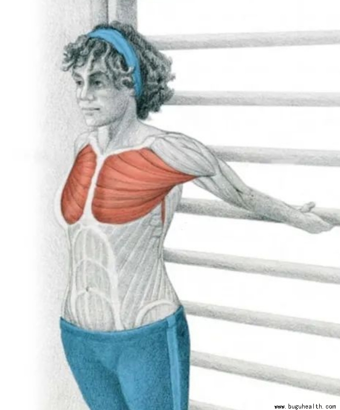 动作要领:站姿双手抓住两侧门框,或面朝墙壁的一个角落站立,双臂展开与躯干垂直,躯干慢慢靠近墙角。