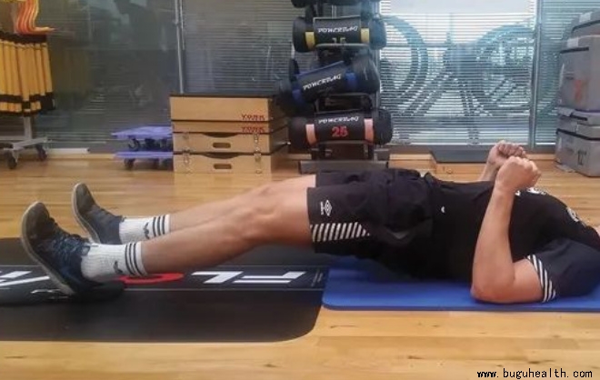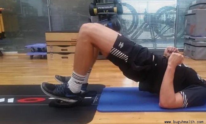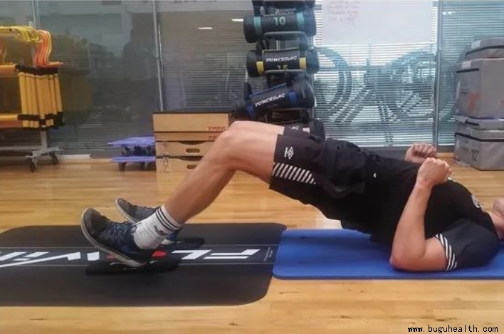 这个动作可以视为是臀桥的一个变式,从仰卧姿势开始,屈膝,保持臀桥姿势,前脚掌抬起,脚后跟踩在滑片或毛巾上。(如果是木地板,可以用毛巾,在垫上练习最好使用训练滑片)