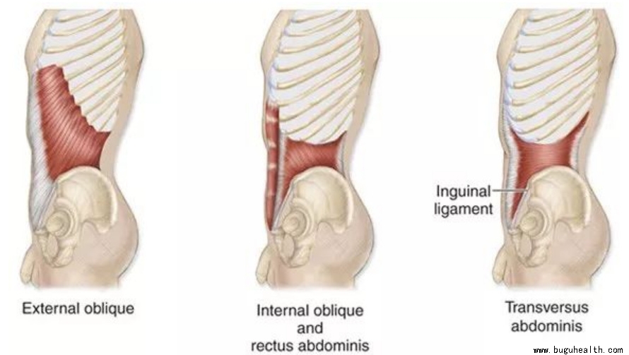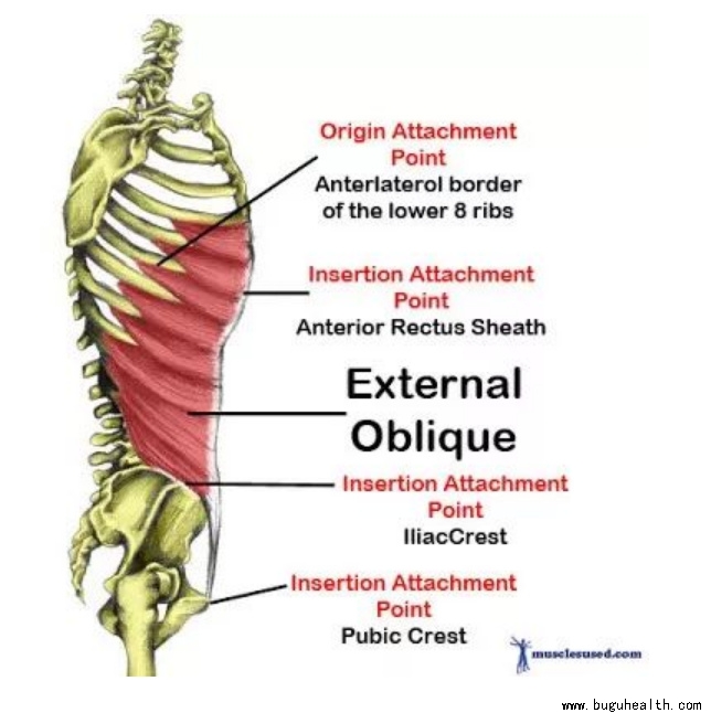 腹外斜肌:从第四根肋骨连到髂脊及耻骨上