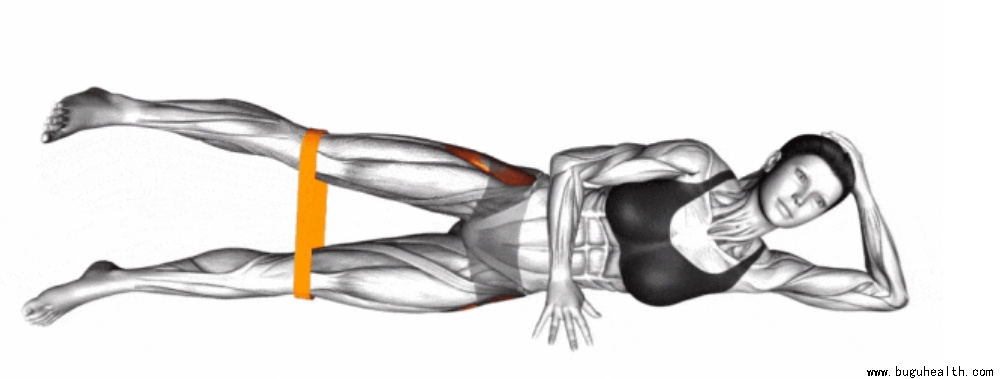 2.呼气,对抗弹力圈使上方腿抬高,至臀部肌肉收紧;吸气,缓慢还原动作至起始位,完成规定次数,换对侧进行。3组,每侧15个一组。