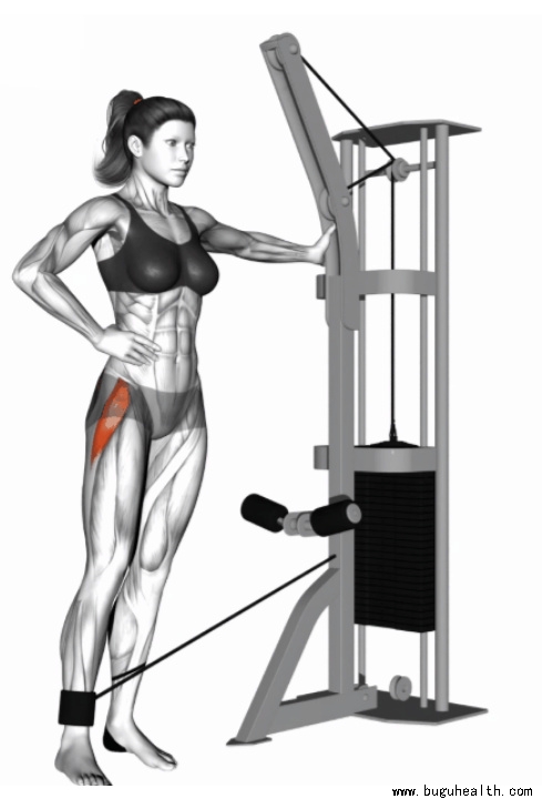 1.站姿,左脚支撑,拉力器绑带固定于右脚脚踝。