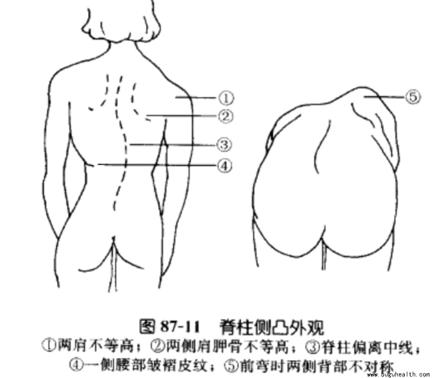 脊柱侧弯具有很多特征性的改变,如双肩不等高;上肢不等长;两侧肩胛骨一高一低,脊柱偏离正中位置,一侧腰部皱褶皮纹;前弯时两侧背部不对称。只要出现上述典型的表现,就要高度怀疑脊柱侧弯发生的可能。