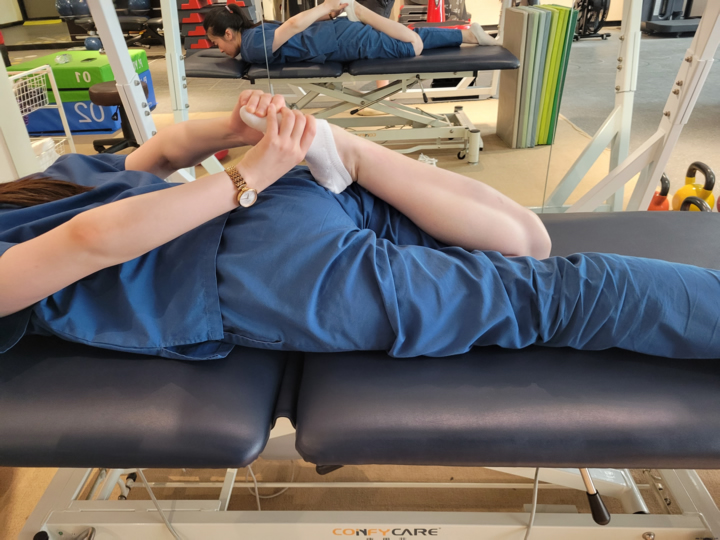 其次是抬高患肢。利用重力的原理将一侧下肢整体抬高于心脏并保持放松状态,加速下肢血液及组织液回流。